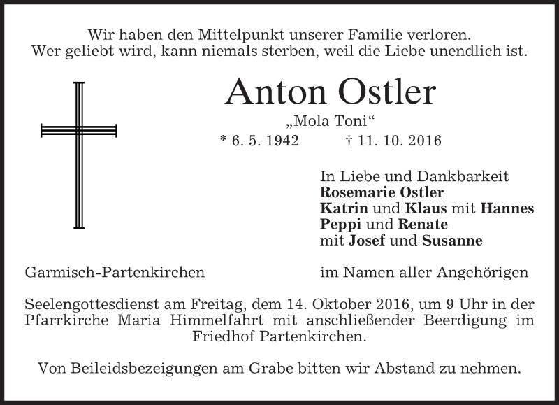 Hier finden Sie alle Traueranzeigen aus der Zeitung, die bisher für Anton Ostler erschienen sind. Weitere Traueranzeigen, die in der Zeitung erscheinen, werden hier ebenfalls aufgelistet