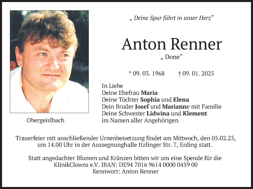 Hier finden Sie alle Traueranzeigen aus der Zeitung, die bisher für Anton Renner erschienen sind. Weitere Traueranzeigen, die in der Zeitung erscheinen, werden hier ebenfalls aufgelistet