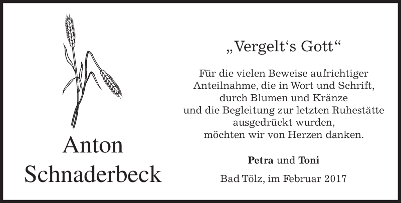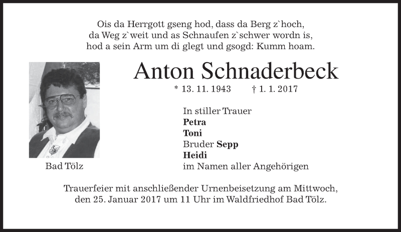 Hier finden Sie alle Traueranzeigen aus der Zeitung, die bisher für Anton Schnaderbeck erschienen sind. Weitere Traueranzeigen, die in der Zeitung erscheinen, werden hier ebenfalls aufgelistet