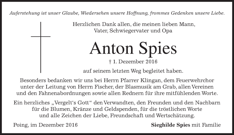 Hier finden Sie alle Traueranzeigen aus der Zeitung, die bisher für Anton Spies erschienen sind. Weitere Traueranzeigen, die in der Zeitung erscheinen, werden hier ebenfalls aufgelistet