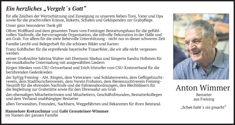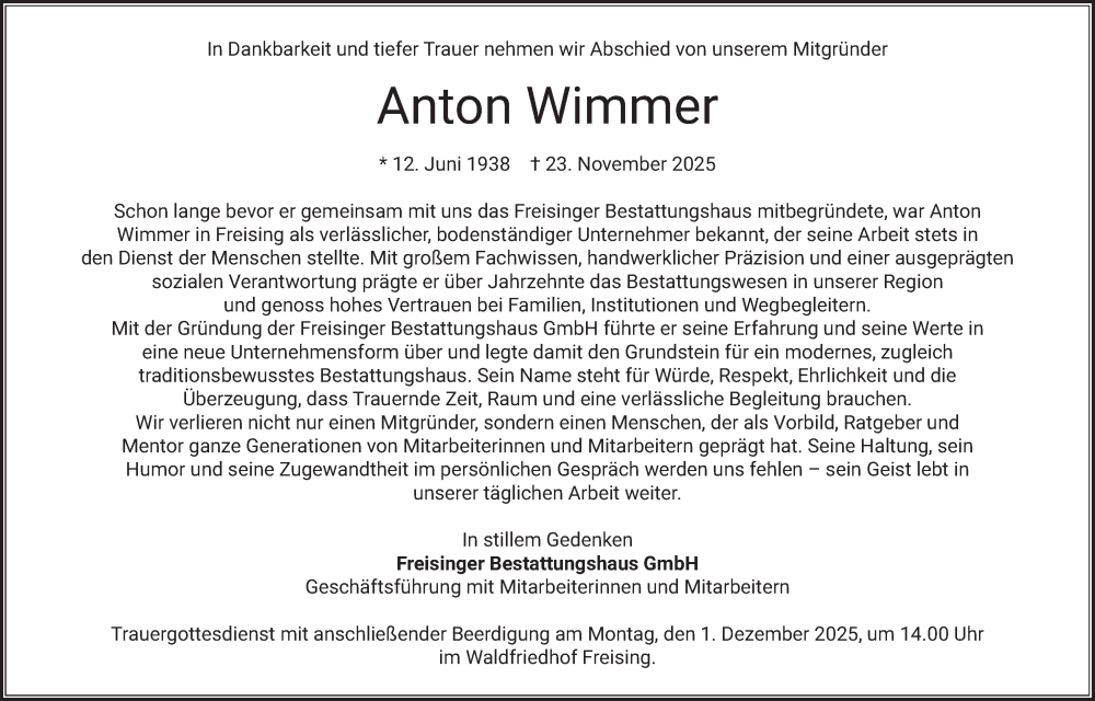 Hier finden Sie alle Traueranzeigen aus der Zeitung, die bisher für Anton Wimmer erschienen sind. Weitere Traueranzeigen, die in der Zeitung erscheinen, werden hier ebenfalls aufgelistet