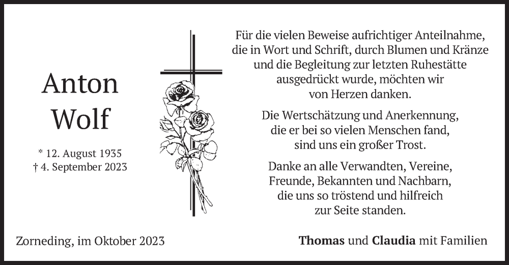Hier finden Sie alle Traueranzeigen aus der Zeitung, die bisher für Anton Wolf erschienen sind. Weitere Traueranzeigen, die in der Zeitung erscheinen, werden hier ebenfalls aufgelistet