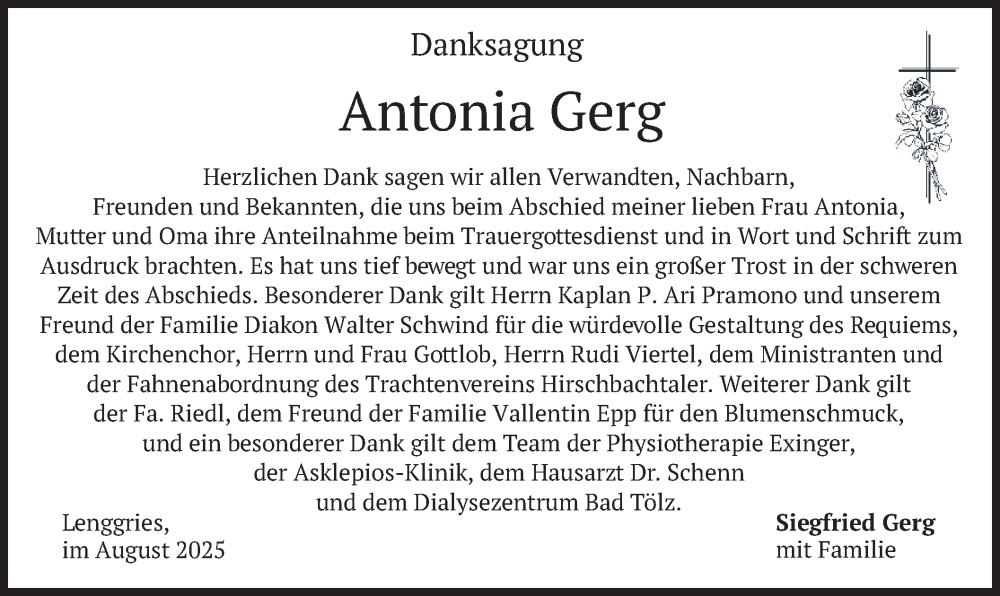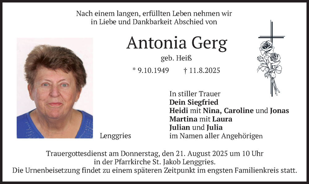 Hier finden Sie alle Traueranzeigen aus der Zeitung, die bisher für Antonia Gerg erschienen sind. Weitere Traueranzeigen, die in der Zeitung erscheinen, werden hier ebenfalls aufgelistet