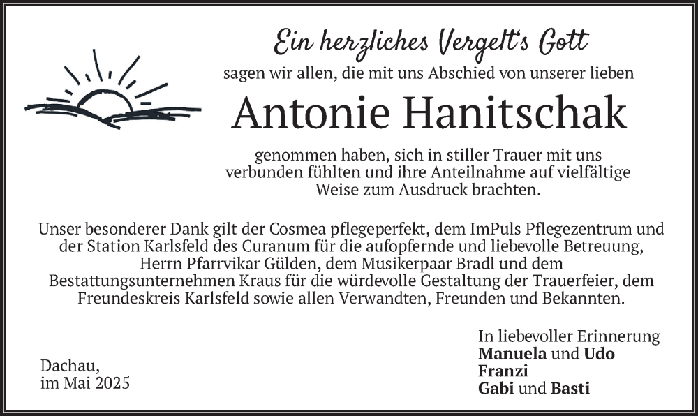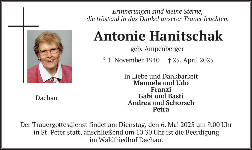 Hier finden Sie alle Traueranzeigen aus der Zeitung, die bisher für Antonie Hanitschak erschienen sind. Weitere Traueranzeigen, die in der Zeitung erscheinen, werden hier ebenfalls aufgelistet