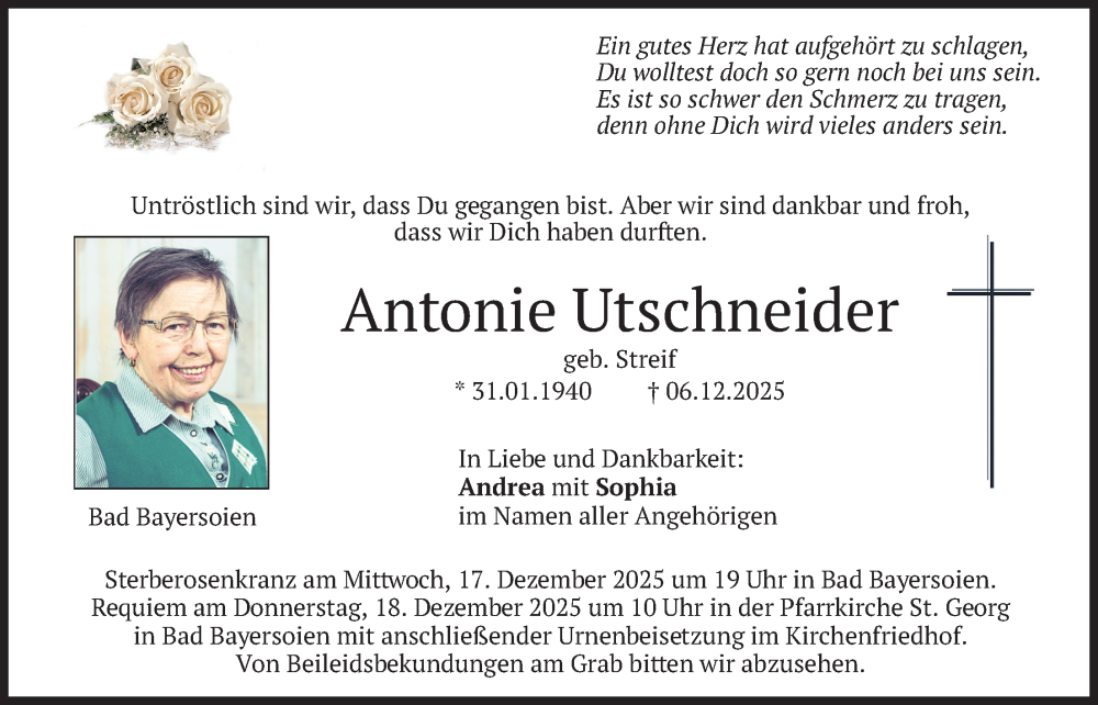 Hier finden Sie alle Traueranzeigen aus der Zeitung, die bisher für Antonie Utschneider erschienen sind. Weitere Traueranzeigen, die in der Zeitung erscheinen, werden hier ebenfalls aufgelistet