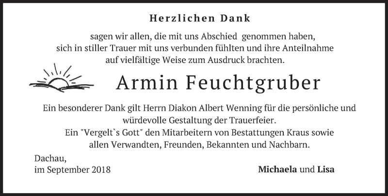 Hier finden Sie alle Traueranzeigen aus der Zeitung, die bisher für Armin Feuchtgruber erschienen sind. Weitere Traueranzeigen, die in der Zeitung erscheinen, werden hier ebenfalls aufgelistet