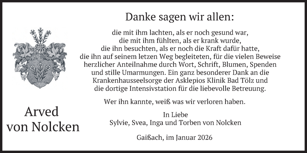Hier finden Sie alle Traueranzeigen aus der Zeitung, die bisher für Arved von Nolcken erschienen sind. Weitere Traueranzeigen, die in der Zeitung erscheinen, werden hier ebenfalls aufgelistet