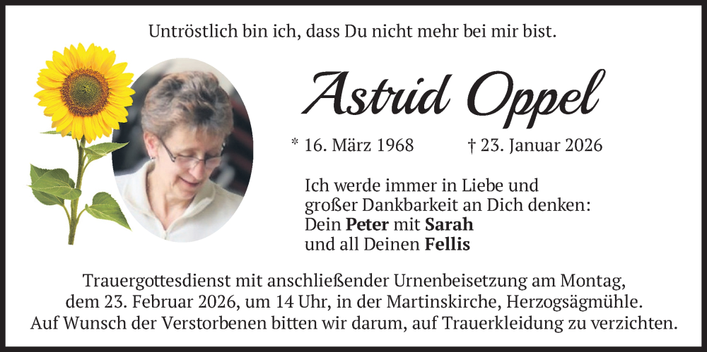 Hier finden Sie alle Traueranzeigen aus der Zeitung, die bisher für Astrid Oppel erschienen sind. Weitere Traueranzeigen, die in der Zeitung erscheinen, werden hier ebenfalls aufgelistet