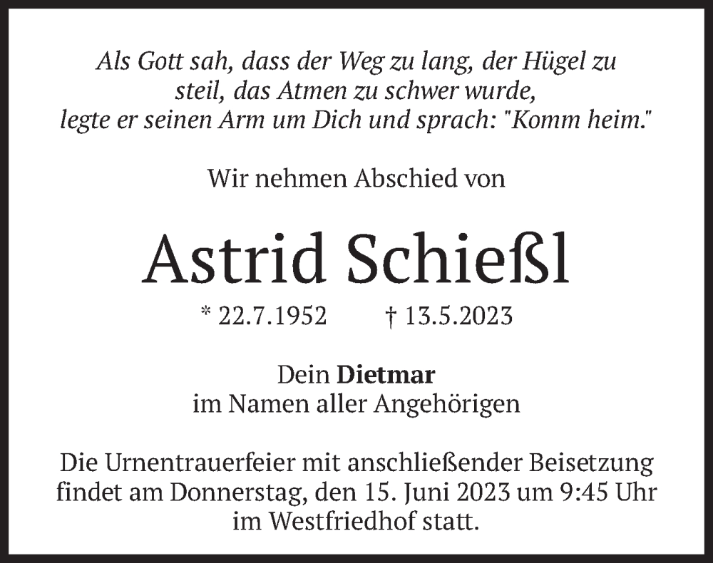 Hier finden Sie alle Traueranzeigen aus der Zeitung, die bisher für Astrid Schießl erschienen sind. Weitere Traueranzeigen, die in der Zeitung erscheinen, werden hier ebenfalls aufgelistet