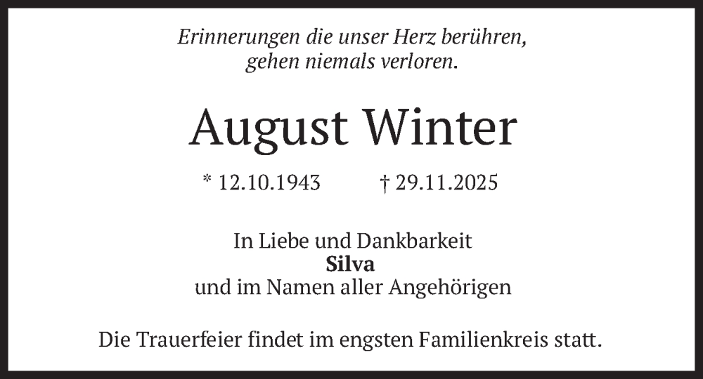 Hier finden Sie alle Traueranzeigen aus der Zeitung, die bisher für August Winter erschienen sind. Weitere Traueranzeigen, die in der Zeitung erscheinen, werden hier ebenfalls aufgelistet