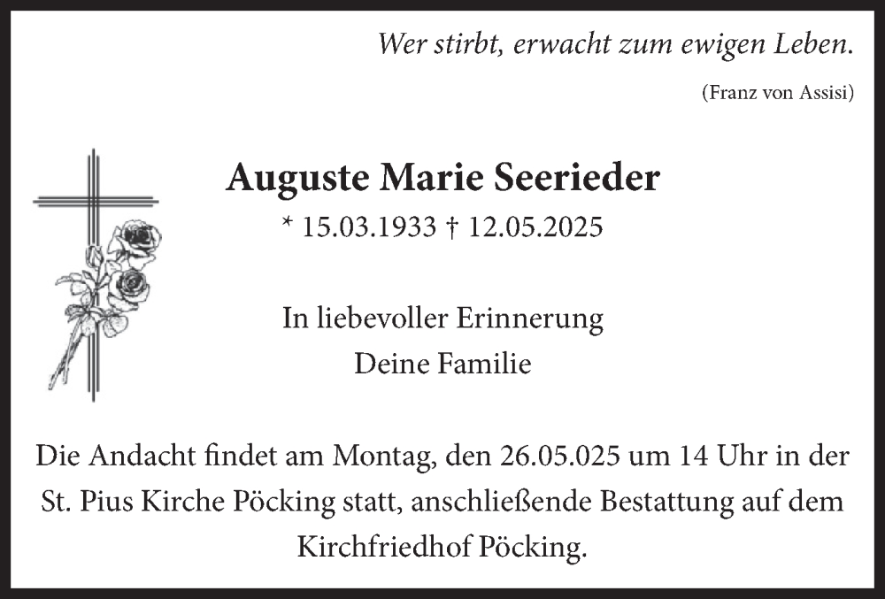 Hier finden Sie alle Traueranzeigen aus der Zeitung, die bisher für Auguste Marie Seerieder erschienen sind. Weitere Traueranzeigen, die in der Zeitung erscheinen, werden hier ebenfalls aufgelistet