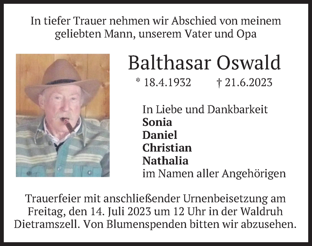 Hier finden Sie alle Traueranzeigen aus der Zeitung, die bisher für Balthasar Oswald erschienen sind. Weitere Traueranzeigen, die in der Zeitung erscheinen, werden hier ebenfalls aufgelistet