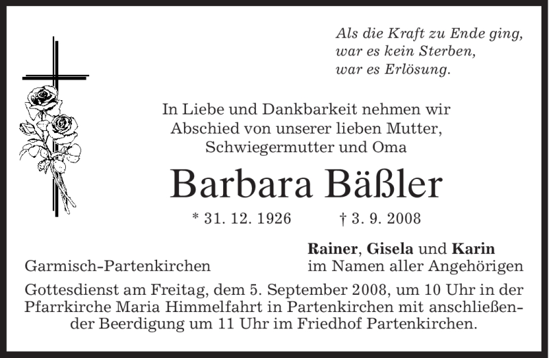 Hier finden Sie alle Traueranzeigen aus der Zeitung, die bisher für Barbara Bäßler erschienen sind. Weitere Traueranzeigen, die in der Zeitung erscheinen, werden hier ebenfalls aufgelistet