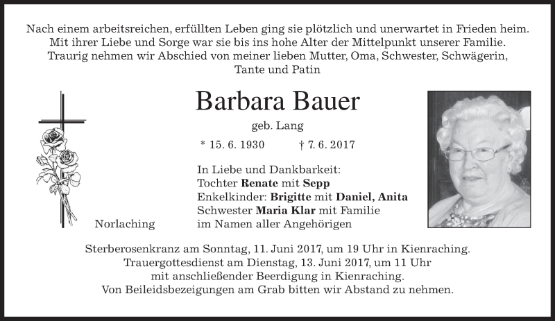 Hier finden Sie alle Traueranzeigen aus der Zeitung, die bisher für Barbara Bauer erschienen sind. Weitere Traueranzeigen, die in der Zeitung erscheinen, werden hier ebenfalls aufgelistet
