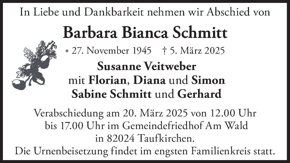 Hier finden Sie alle Traueranzeigen aus der Zeitung, die bisher für Barbara Bianca Schmitt erschienen sind. Weitere Traueranzeigen, die in der Zeitung erscheinen, werden hier ebenfalls aufgelistet