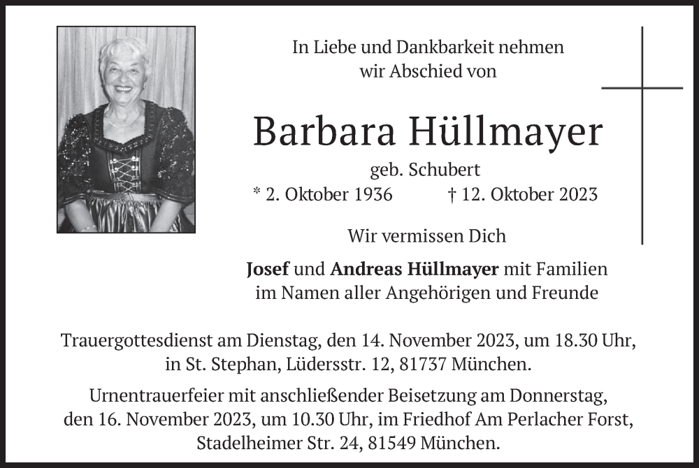 Hier finden Sie alle Traueranzeigen aus der Zeitung, die bisher für Barbara Hüllmayer erschienen sind. Weitere Traueranzeigen, die in der Zeitung erscheinen, werden hier ebenfalls aufgelistet