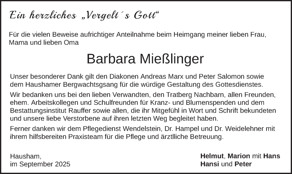 Hier finden Sie alle Traueranzeigen aus der Zeitung, die bisher für Barbara Mießlinger erschienen sind. Weitere Traueranzeigen, die in der Zeitung erscheinen, werden hier ebenfalls aufgelistet