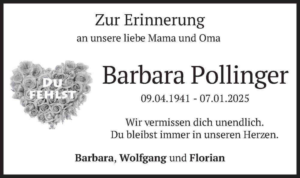 Hier finden Sie alle Traueranzeigen aus der Zeitung, die bisher für Barbara Pollinger erschienen sind. Weitere Traueranzeigen, die in der Zeitung erscheinen, werden hier ebenfalls aufgelistet