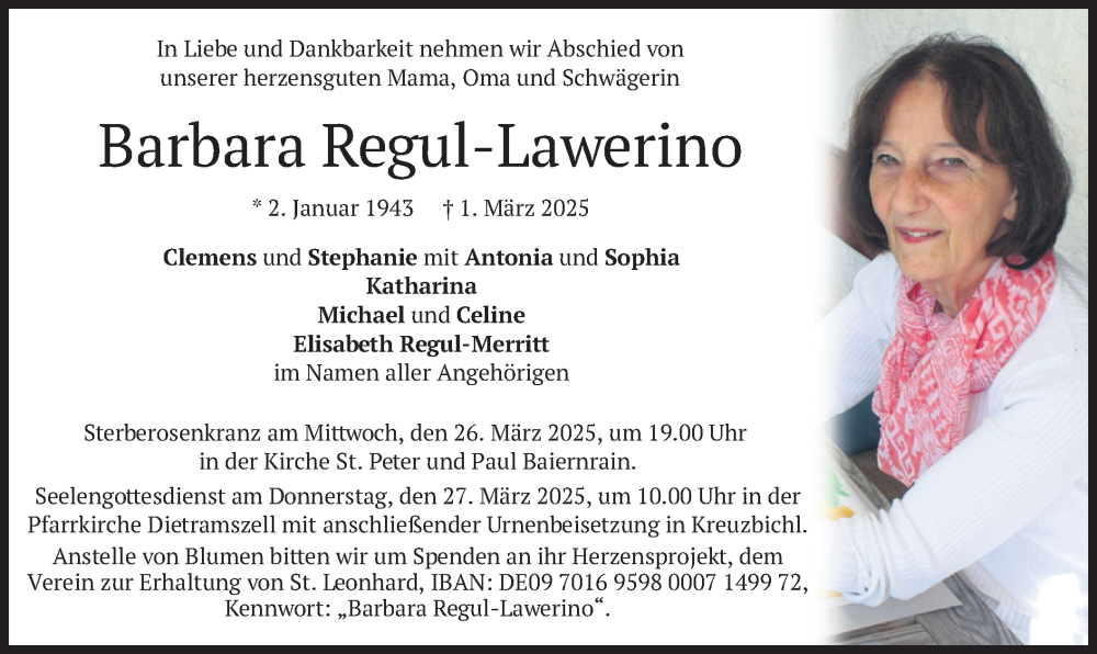 Hier finden Sie alle Traueranzeigen aus der Zeitung, die bisher für Barbara Regul-Lawerino erschienen sind. Weitere Traueranzeigen, die in der Zeitung erscheinen, werden hier ebenfalls aufgelistet