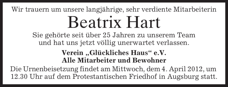 Hier finden Sie alle Traueranzeigen aus der Zeitung, die bisher für Beatrix Hart erschienen sind. Weitere Traueranzeigen, die in der Zeitung erscheinen, werden hier ebenfalls aufgelistet