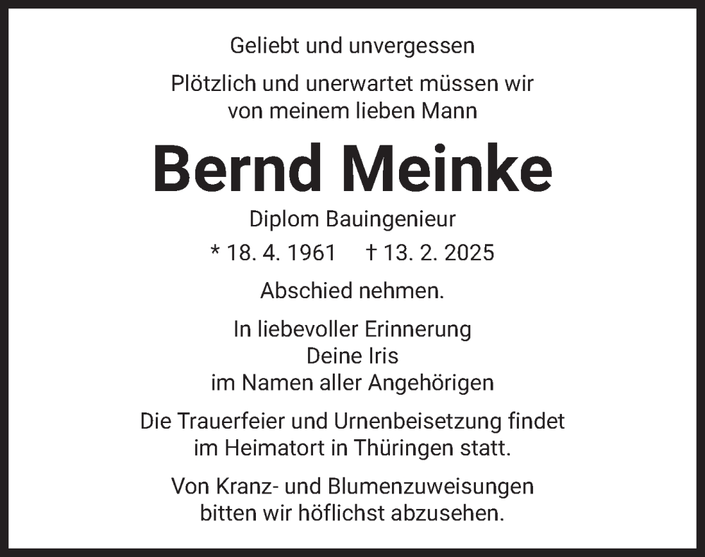 Hier finden Sie alle Traueranzeigen aus der Zeitung, die bisher für Bernd Meinke erschienen sind. Weitere Traueranzeigen, die in der Zeitung erscheinen, werden hier ebenfalls aufgelistet