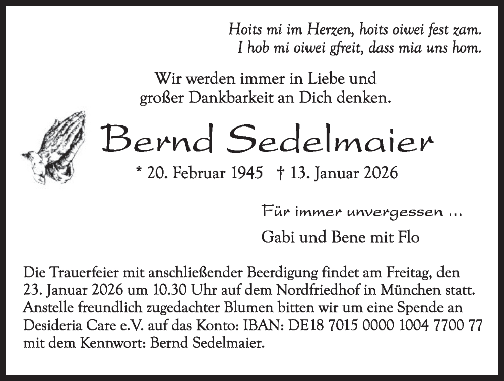 Hier finden Sie alle Traueranzeigen aus der Zeitung, die bisher für Bernd Sedelmaier erschienen sind. Weitere Traueranzeigen, die in der Zeitung erscheinen, werden hier ebenfalls aufgelistet