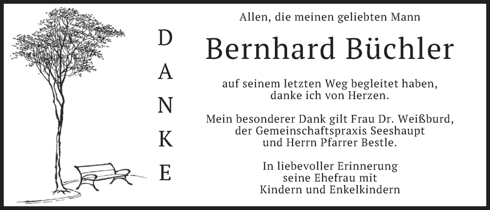 Hier finden Sie alle Traueranzeigen aus der Zeitung, die bisher für Bernhard Büchler erschienen sind. Weitere Traueranzeigen, die in der Zeitung erscheinen, werden hier ebenfalls aufgelistet