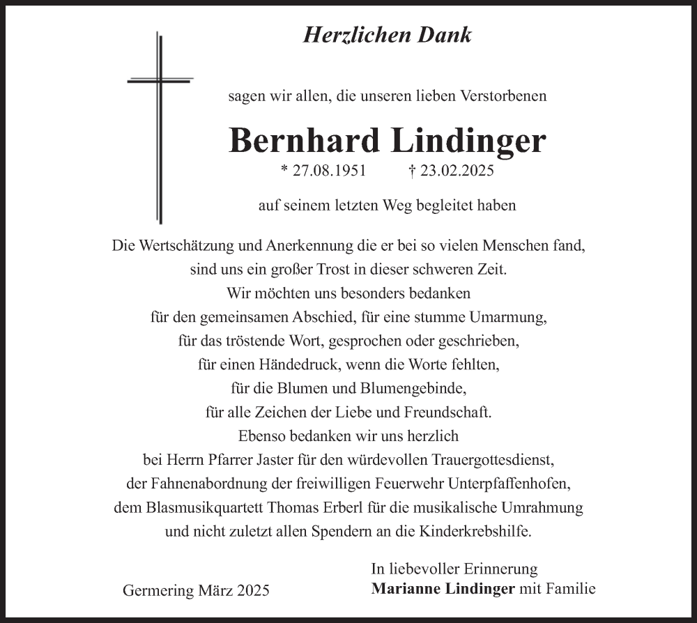 Hier finden Sie alle Traueranzeigen aus der Zeitung, die bisher für Bernhard Lindinger erschienen sind. Weitere Traueranzeigen, die in der Zeitung erscheinen, werden hier ebenfalls aufgelistet