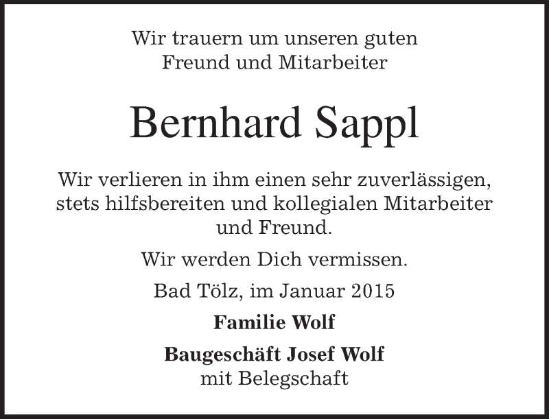 Hier finden Sie alle Traueranzeigen aus der Zeitung, die bisher für Bernhard Sappl erschienen sind. Weitere Traueranzeigen, die in der Zeitung erscheinen, werden hier ebenfalls aufgelistet