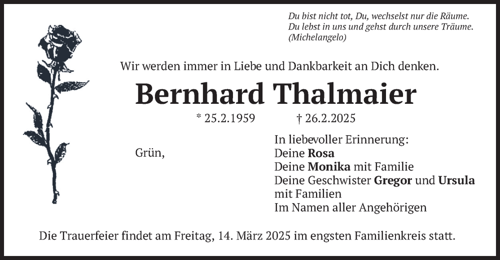 Hier finden Sie alle Traueranzeigen aus der Zeitung, die bisher für Bernhard Thalmaier erschienen sind. Weitere Traueranzeigen, die in der Zeitung erscheinen, werden hier ebenfalls aufgelistet