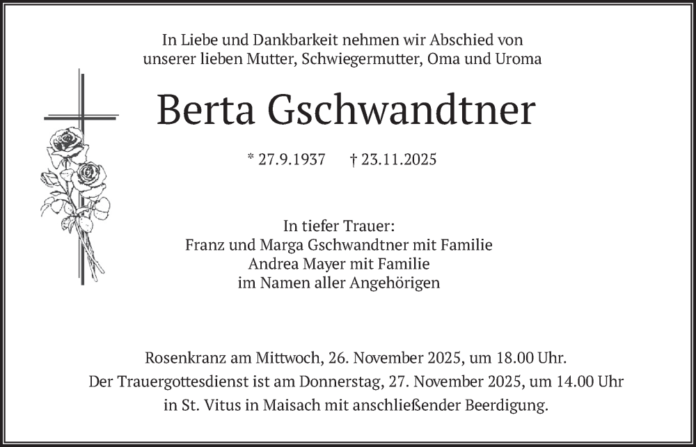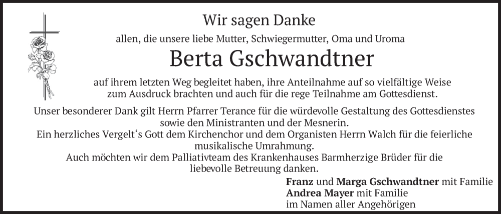 Hier finden Sie alle Traueranzeigen aus der Zeitung, die bisher für Berta Gschwandtner erschienen sind. Weitere Traueranzeigen, die in der Zeitung erscheinen, werden hier ebenfalls aufgelistet