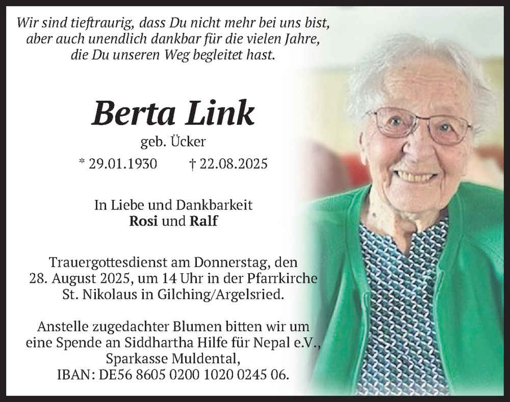 Hier finden Sie alle Traueranzeigen aus der Zeitung, die bisher für Berta Link erschienen sind. Weitere Traueranzeigen, die in der Zeitung erscheinen, werden hier ebenfalls aufgelistet