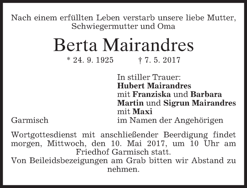 Hier finden Sie alle Traueranzeigen aus der Zeitung, die bisher für Berta Mairandres erschienen sind. Weitere Traueranzeigen, die in der Zeitung erscheinen, werden hier ebenfalls aufgelistet