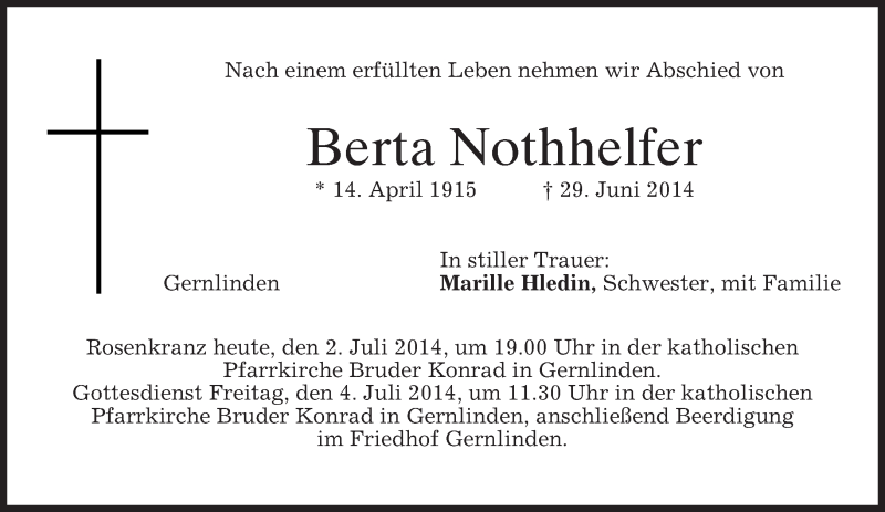 Hier finden Sie alle Traueranzeigen aus der Zeitung, die bisher für Berta Nothhelfer erschienen sind. Weitere Traueranzeigen, die in der Zeitung erscheinen, werden hier ebenfalls aufgelistet