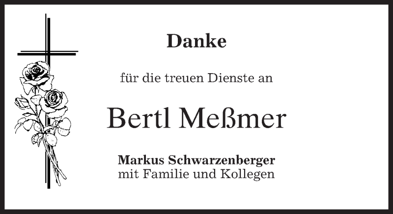 Hier finden Sie alle Traueranzeigen aus der Zeitung, die bisher für Bertl Meßmer erschienen sind. Weitere Traueranzeigen, die in der Zeitung erscheinen, werden hier ebenfalls aufgelistet