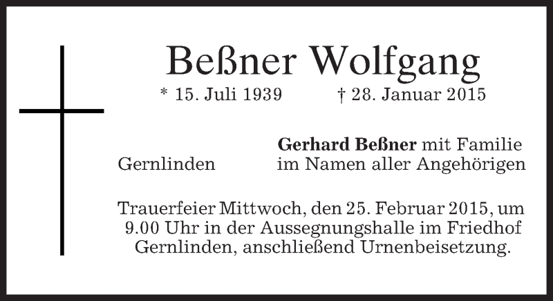 Hier finden Sie alle Traueranzeigen aus der Zeitung, die bisher für Beßner Wolfgang erschienen sind. Weitere Traueranzeigen, die in der Zeitung erscheinen, werden hier ebenfalls aufgelistet