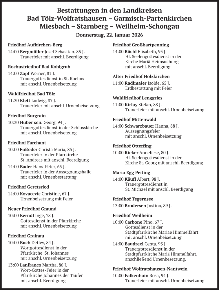 Hier finden Sie alle Traueranzeigen aus der Zeitung, die bisher für Bestattungen vom 22.01.2026 erschienen sind. Weitere Traueranzeigen, die in der Zeitung erscheinen, werden hier ebenfalls aufgelistet