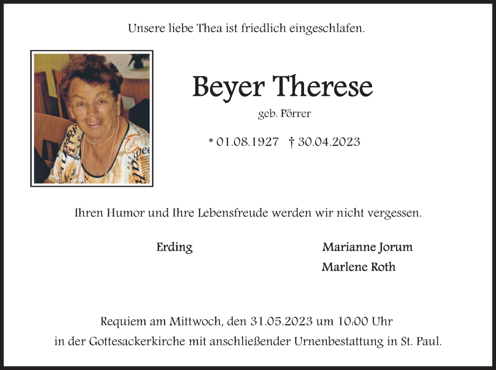Hier finden Sie alle Traueranzeigen aus der Zeitung, die bisher für Beyer Therese erschienen sind. Weitere Traueranzeigen, die in der Zeitung erscheinen, werden hier ebenfalls aufgelistet