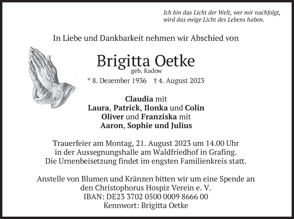 Hier finden Sie alle Traueranzeigen aus der Zeitung, die bisher für Brigitta Oetke erschienen sind. Weitere Traueranzeigen, die in der Zeitung erscheinen, werden hier ebenfalls aufgelistet
