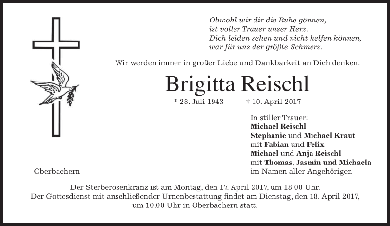 Hier finden Sie alle Traueranzeigen aus der Zeitung, die bisher für Brigitta Reischl erschienen sind. Weitere Traueranzeigen, die in der Zeitung erscheinen, werden hier ebenfalls aufgelistet