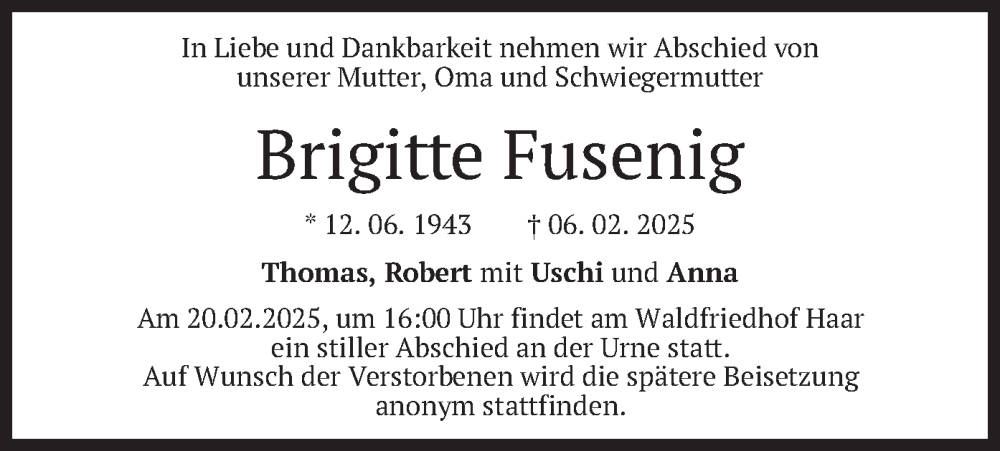 Hier finden Sie alle Traueranzeigen aus der Zeitung, die bisher für Brigitte Fusenig erschienen sind. Weitere Traueranzeigen, die in der Zeitung erscheinen, werden hier ebenfalls aufgelistet