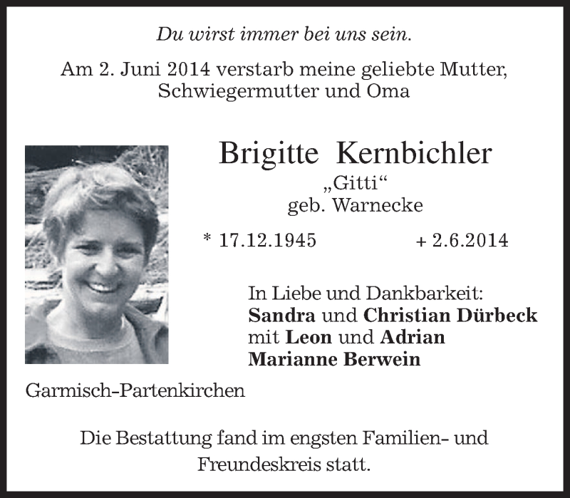 Hier finden Sie alle Traueranzeigen aus der Zeitung, die bisher für Brigitte Kernbichler erschienen sind. Weitere Traueranzeigen, die in der Zeitung erscheinen, werden hier ebenfalls aufgelistet