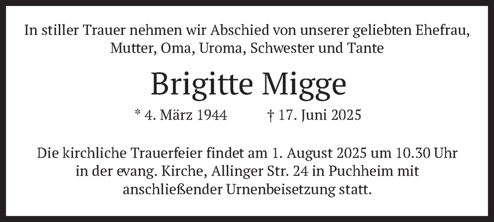 Hier finden Sie alle Traueranzeigen aus der Zeitung, die bisher für Brigitte Migge erschienen sind. Weitere Traueranzeigen, die in der Zeitung erscheinen, werden hier ebenfalls aufgelistet