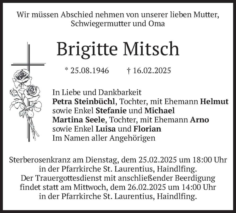 Hier finden Sie alle Traueranzeigen aus der Zeitung, die bisher für Brigitte Mitsch erschienen sind. Weitere Traueranzeigen, die in der Zeitung erscheinen, werden hier ebenfalls aufgelistet