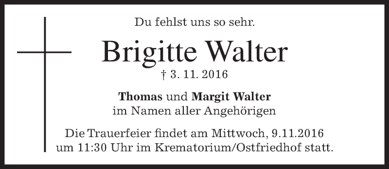 Hier finden Sie alle Traueranzeigen aus der Zeitung, die bisher für Brigitte Walter erschienen sind. Weitere Traueranzeigen, die in der Zeitung erscheinen, werden hier ebenfalls aufgelistet