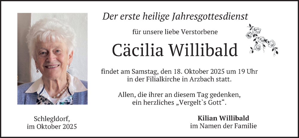 Hier finden Sie alle Traueranzeigen aus der Zeitung, die bisher für Cäcilia Willibald erschienen sind. Weitere Traueranzeigen, die in der Zeitung erscheinen, werden hier ebenfalls aufgelistet