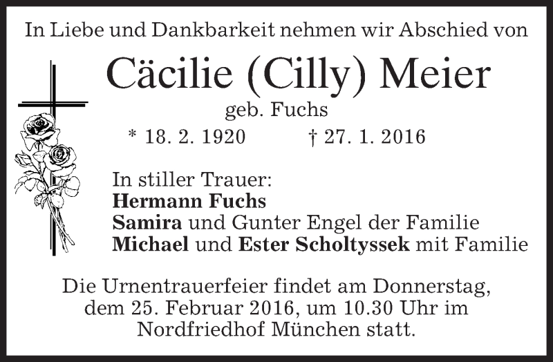 Hier finden Sie alle Traueranzeigen aus der Zeitung, die bisher für Cäcilie Cilly Meier erschienen sind. Weitere Traueranzeigen, die in der Zeitung erscheinen, werden hier ebenfalls aufgelistet