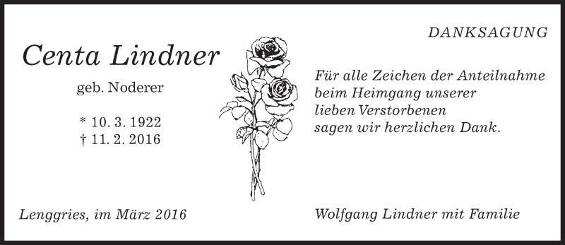Hier finden Sie alle Traueranzeigen aus der Zeitung, die bisher für Centa Lindner erschienen sind. Weitere Traueranzeigen, die in der Zeitung erscheinen, werden hier ebenfalls aufgelistet