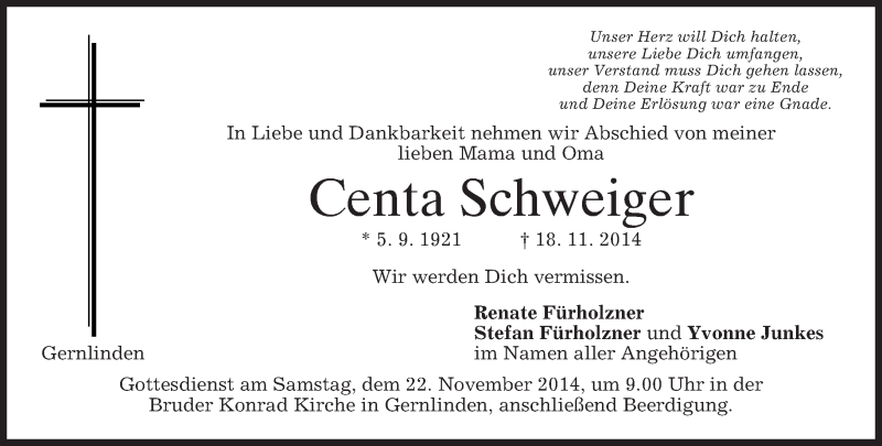 Hier finden Sie alle Traueranzeigen aus der Zeitung, die bisher für Centa Schweiger erschienen sind. Weitere Traueranzeigen, die in der Zeitung erscheinen, werden hier ebenfalls aufgelistet