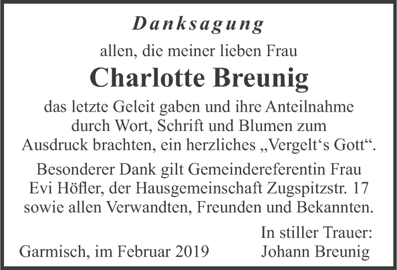 Hier finden Sie alle Traueranzeigen aus der Zeitung, die bisher für Charlotte Breunig erschienen sind. Weitere Traueranzeigen, die in der Zeitung erscheinen, werden hier ebenfalls aufgelistet